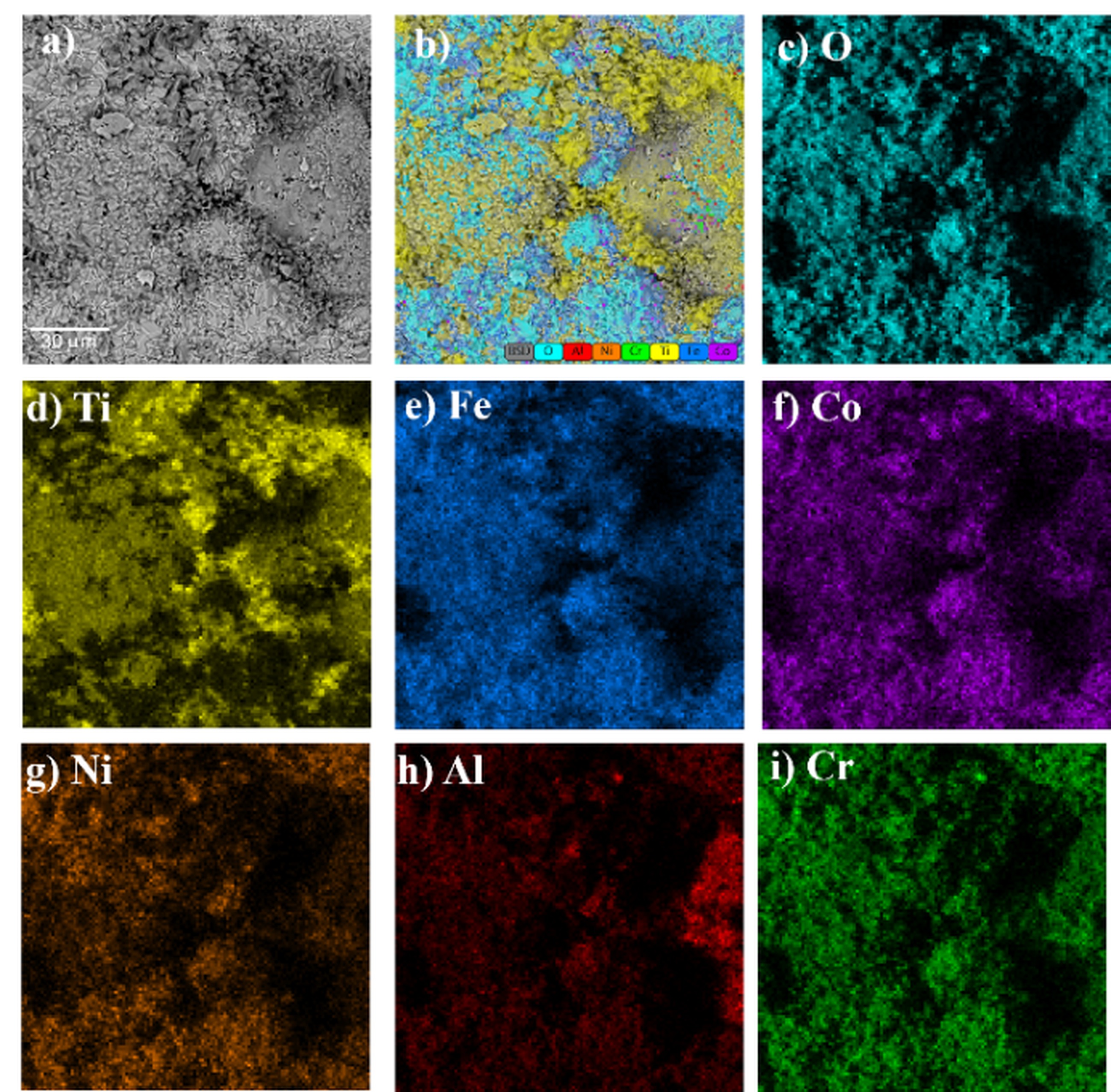 Fig. 9. Morphology of an oxide scale of the Ref+0.2Ti sample after air oxidation for 1000 h: a) SEM image, b) combined map EDS, c-i) mapping of elements