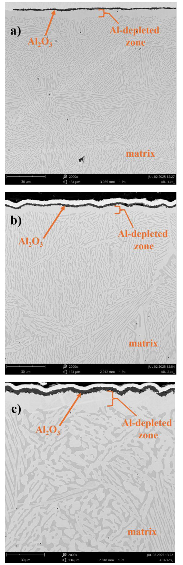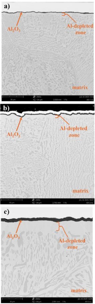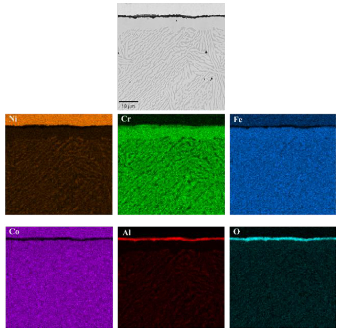 The cross-sectional analysis of the samples after oxidation confirms the surface morphology observations. On the surface of the Ref alloy without titanium, exposure to high-temperature oxidation resulted in the formation of a thin, compact Al2O3 layer, which protects the metallic substrate from further oxidation (Fig. 12). Beneath the alumina layer, a single-phase region depleted in aluminum is observed. As the Al2O3 scale forms, the interdendritic phase rich in aluminum disappears from the subsurface structure. With prolonged high-temperature exposure, the thickness of both layers increases slightly. Microstructural coarsening is also evident (Fig. 12a-c). These findings are supported by EDS elemental mapping of the alloy’s constituent elements (Fig. 13).