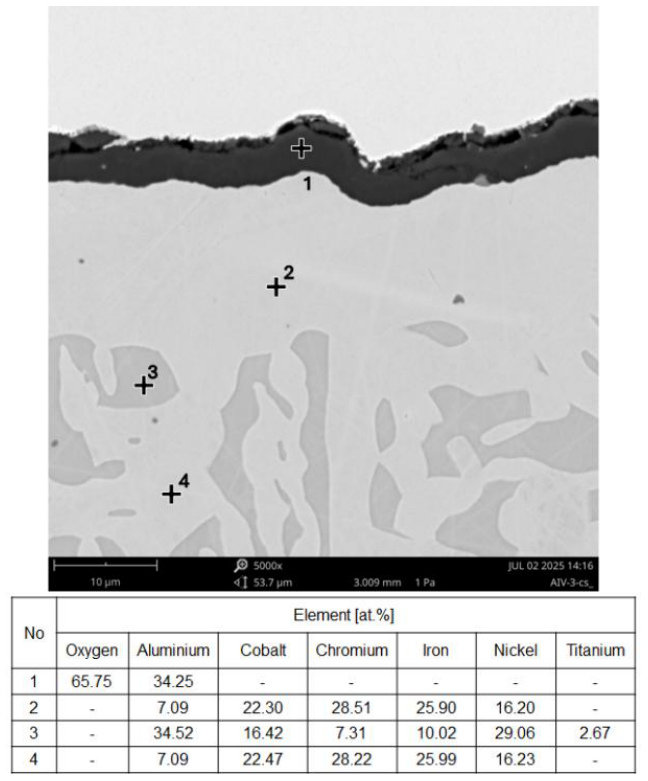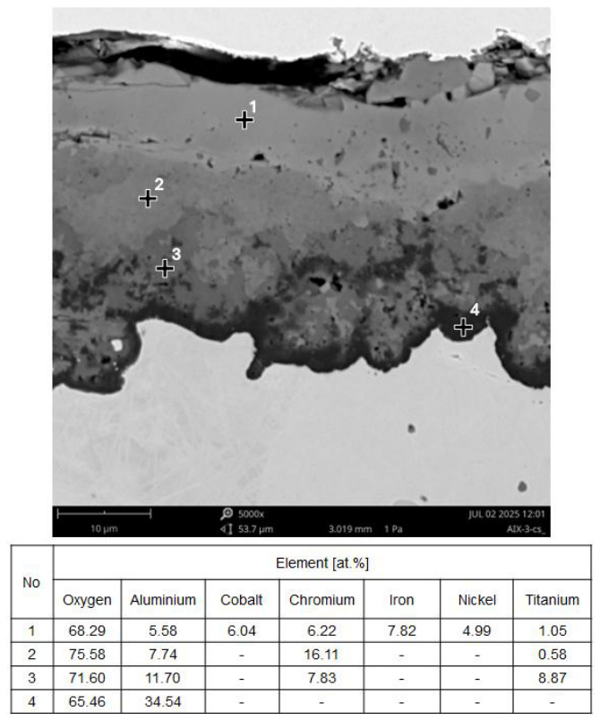 In the oxide layer formed after 1000 hours of high-temperature exposure, four sublayers with distinct chemical compositions can be identified (Fig. 19). The outermost layer is structurally homogeneous and contains all alloying elements in approximately equal proportions (Fig. 19, point 1). Beneath it lies a thin layer of Cr oxides with some Al content (point 2). Below this is a porous spinel layer with a high Ti content (point 3). The innermost oxide layer is composed of Al2O3 (point 4). Similar layered oxide structures were observed by Jalowicka and Nowak [41] after oxidation of a titanium-containing nickel-base superalloy for 20 hours in synthetic air at 1050 °C.