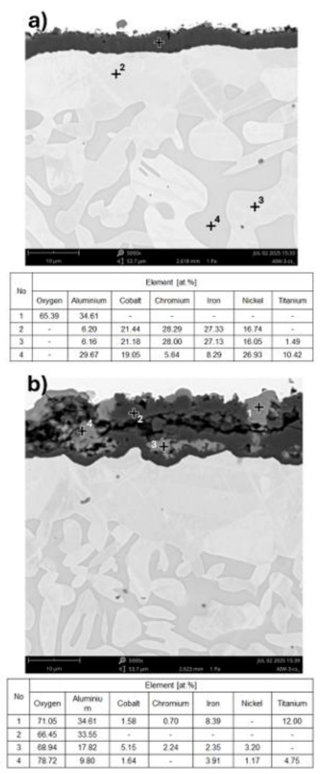 Fig. 17. EDS point analysis of the cross-section of the Ref+0.2Ti sample after air oxidation for 1000 h a) continuous Al 2 O 3 layer, b) cross-section of complex oxide precipitates