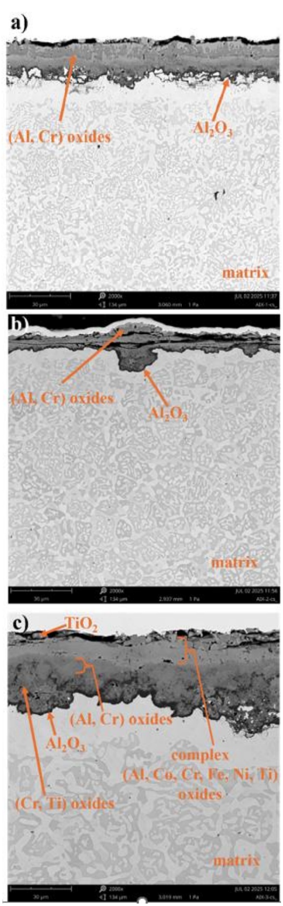 The cross-section images of the Ref+0.5Ti alloy samples differs significantly and confirms the surface morphology analysis of this material (Fig. 18a–c). After 24 hours of high-temperature exposure, a thick oxide layer (~10 μm) forms on the sample surface, clearly divided into three regions with distinct chemical compositions. An outer spinel layer can be distinguished, followed by a layer of Cr and Al oxides containing Ti. At the interface with the metallic matrix, a thin Al2O3 layer is visible, indicating internal oxidation of aluminum. This interface is irregular and undulated, which may promote oxide delamination (Fig. 18a). In Figure 18b, showing the cross-section after 100 hours of oxidation, the oxide layer is significantly thinner, suggesting delamination of porous oxides. Locally, complex multilayered oxide structures with high porosity can be observed. After 1000 hours of high-temperature exposure, the oxide layer becomes thick (~30 μm) and porous (Fig. 18c).