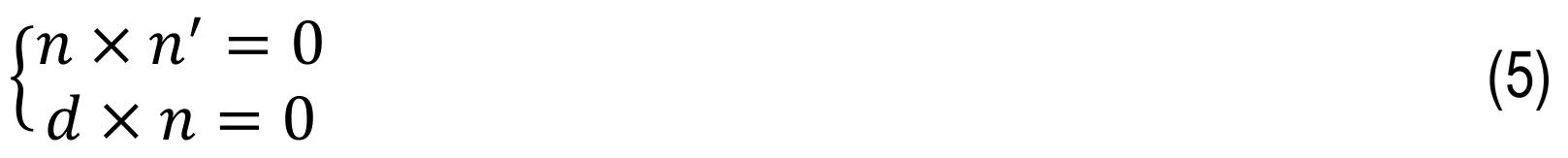 Therefore, for the representation of the maximum penetration depth by contact equation, three geometrical conditions can be defined as follows: (i) the distance between the potential contact points defined by the vector d should be equal to the minimum distance; (ii) the vector n is collinear with vector d; (iii) the n and n′ vectors at the contact potential points must be collinear. The terms (ii) and (iii) can be expressed in terms of cross-products.