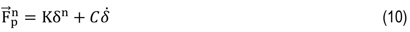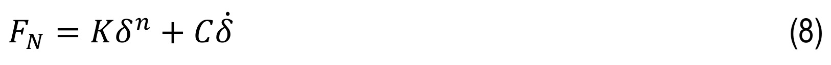 Kelvin–Voigt model includes the viscoelastic behavior and presents the behavior of a media with a series of discrete springs parallel with dampers. In other words, Kelvin– Voigt enters the effects of viscoelasticity into the elastic Hertz model. The relation between the restoring force and displacement is found using the following relation [48]:
