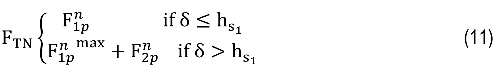where Fₙ, Fₜ are normal contact force and friction force and eliminating friction force, normal contact force is obtained as follows:TNis the total normal contact force and F1pn,F1pnmax are the contact forces due to the penetration depth of the first layer and F2pn is the contact force due to the penetration depth of the second layer [9]. Considering viscosity, the proposed model based on the concept of viscoelastic two-layer collision modeling can be recast as follows: