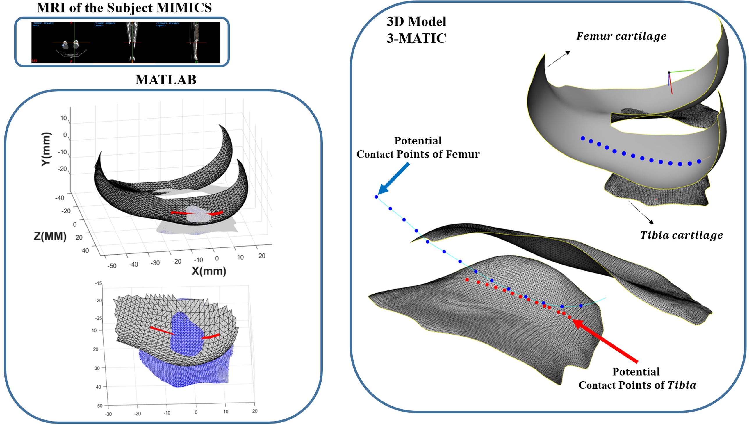 With the development of a dynamic knee model that enables analysis of tibiofemoral contact mechanics, an accurate and precise definition of the articular contact surfaces between the tibia and femur is essential and unavoidable. Therefore, magnetic resonance imaging (MRI) data of the knee were utilized to obtain detailed geometric characteristics of the joint surfaces. Based on the MRI images, two sets of data points were extracted to represent the geometry of the tibial and femoral cartilage surfaces.