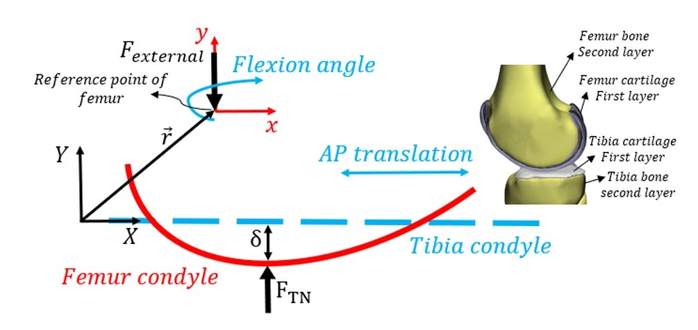 A forward dynamics model of the femur was developed, allowing free translation and rotation with 3 degrees of freedom (DOF). Within this dynamic system, two degrees of freedom—specifically the flexion-extension angle and anterior-posterior translation—were constrained using known kinematic data. The motion is defined in the sagittal plane using the (X, Y) coordinate system illustrated in Fig. 4. The values for the two constrained parameters were derived from motion capture analysis and dynamic knee MRI data [30]. The proposed methodology was implemented in a computational algorithm, with the workflow schematically presented in Fig. 5. This study focuses on quantifying tibiofemoral indentation depth during the gait cycle using a planar knee model. The model incorporates a generalized collision detection algorithm and contact mechanics formulation. The tibia was assumed fixed, while the femur was permitted translational and rotational motion within the plane. Initial conditions were obtained from the static solution of forces applied to the tibia. The outputs of the computational framework (Fig. 5) include contact force, contact points, indentation depth, and displacement of the femur’s center of mass along the Y-axis.
