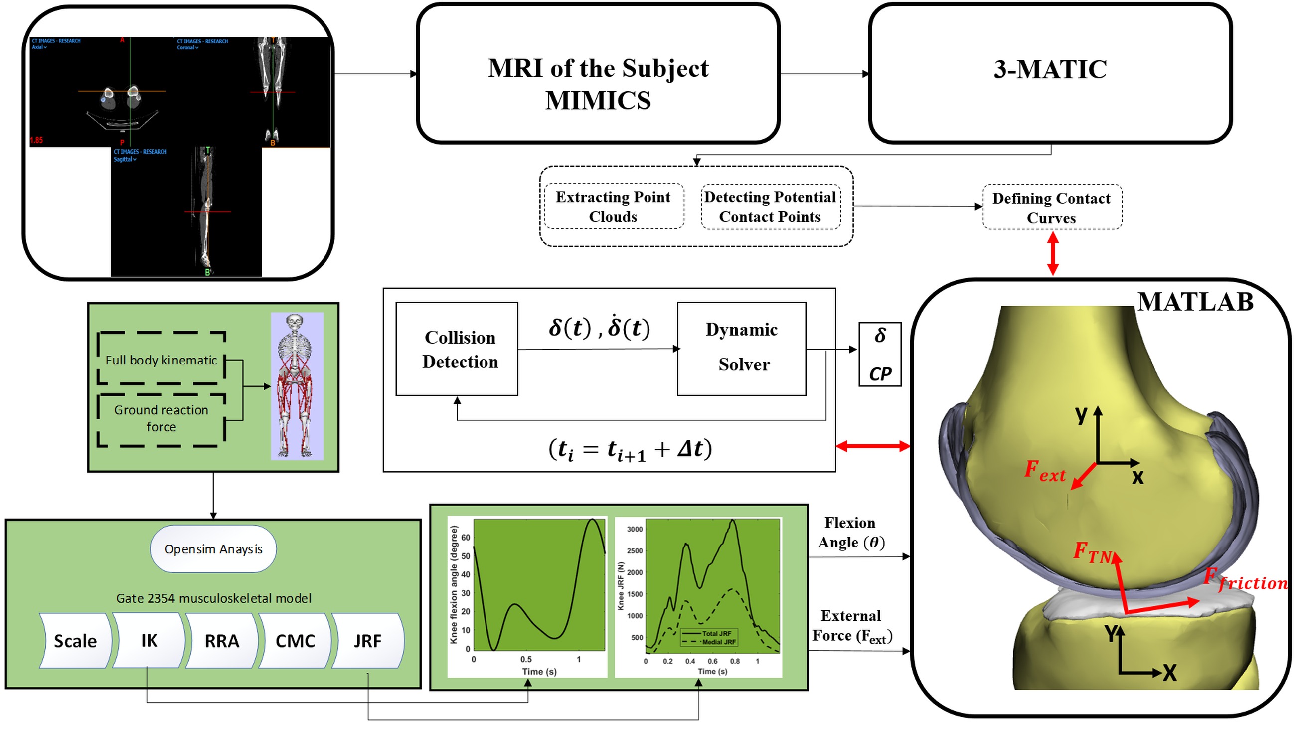 This study investigates the influence of contact model properties on knee joint function. The motion is modeled using the musculoskeletal model available in OpenSim (V.3.3, SimTK), which predicts the medial compartment tibiofemoral contact force (Fₜₙ) at the knee, providing a realistic representation of normal, healthy knee biomechanics. For this analysis, an unscaled version of the model representing a subject approximately 1.8 m tall with a body weight (BW) of 75.16 kg was employed. Figure 6a illustrates the sequential steps involved in calculating knee forces. The computational procedure encompasses generic model scaling, Computed Muscle Control (CMC), Inverse Kinematics (IK), Inverse Dynamics (ID), Residual Reduction Algorithm (RRA), and Joint Reaction Force (JRF) analysis.TN) at the knee, providing a realistic representation of normal, healthy knee biomechanics. For this analysis, an unscaled version of the model representing a subject approximately 1.8 m tall with a body weight (BW) of 75.16 kg was employed. Figure 6a illustrates the sequential steps involved in calculating knee forces. The computational procedure encompasses generic model scaling, Computed Muscle Control (CMC), Inverse Kinematics (IK), Inverse Dynamics (ID), Residual Reduction Algorithm (RRA), and Joint Reaction Force (JRF) analysis.