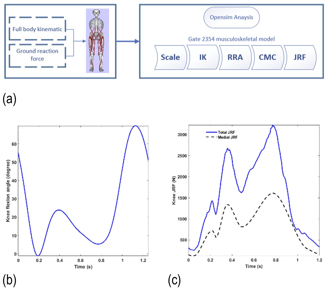 Fig. 6. Joint reaction force (JFR) analysis (a) OpenSim platform; (b) knee flexion angle; (c) total and medial joint reaction force