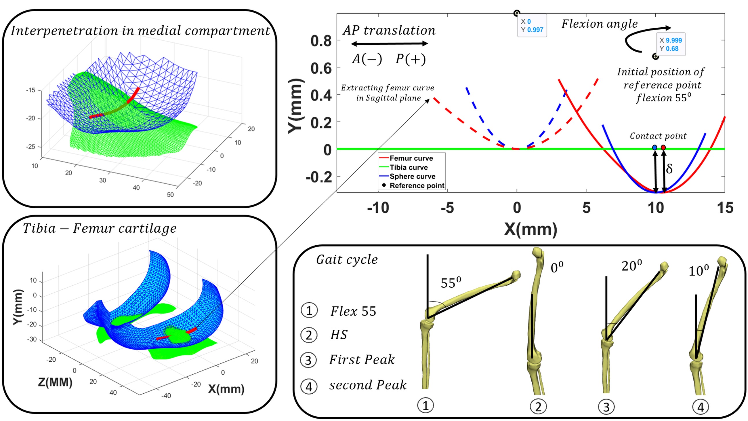 Comparison between the curve-fitted and sphere-plane models reveals reduced cartilage penetration depth (δ) in the curve-fitted model, despite similar contact forces. Numerical results correspond to the second peak of contact force during the gait cycle. The curve-fitting approach yielded a cartilage penetration depth of 0.705 mm, representing a 0.6% reduction compared to the spherical model. As a key contribution, this study successfully integrates tibiofemoral cartilage penetration depth into biomechanical gait simulation. Figure 12 delineates medial tibiofemoral joint penetration depth and contact points during four critical gait phases: (a) 55° flexion, (b) heel-strike, (c) first peak, and (d) second peak, referenced to the anterior-posterior direction.