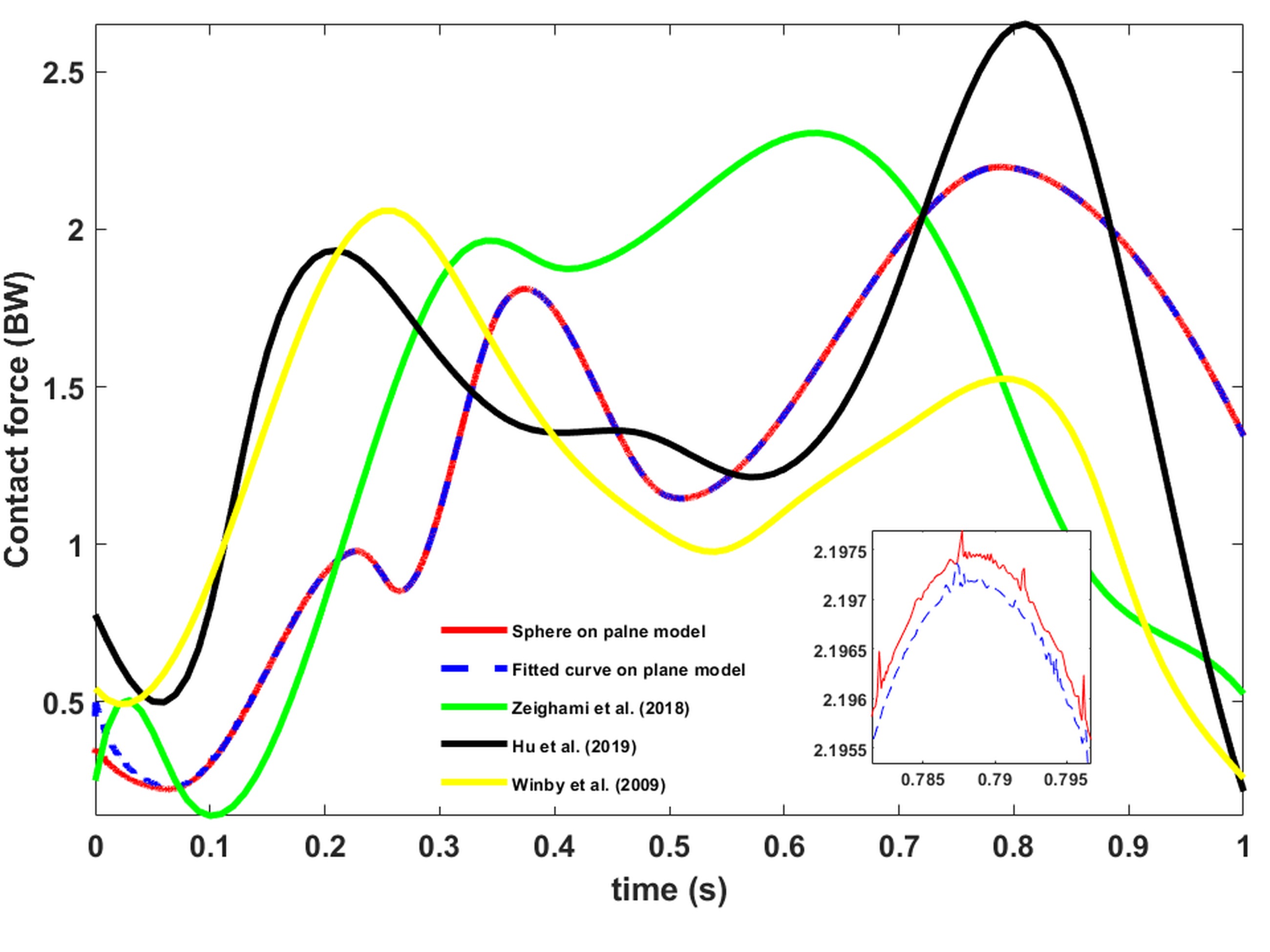 Fig. 8. Comparison of the medial knee joint contact force using the curve-fitting method for the femoral contact profile and the spherical femur model, along with validation against previous studies (BW: Body weight)