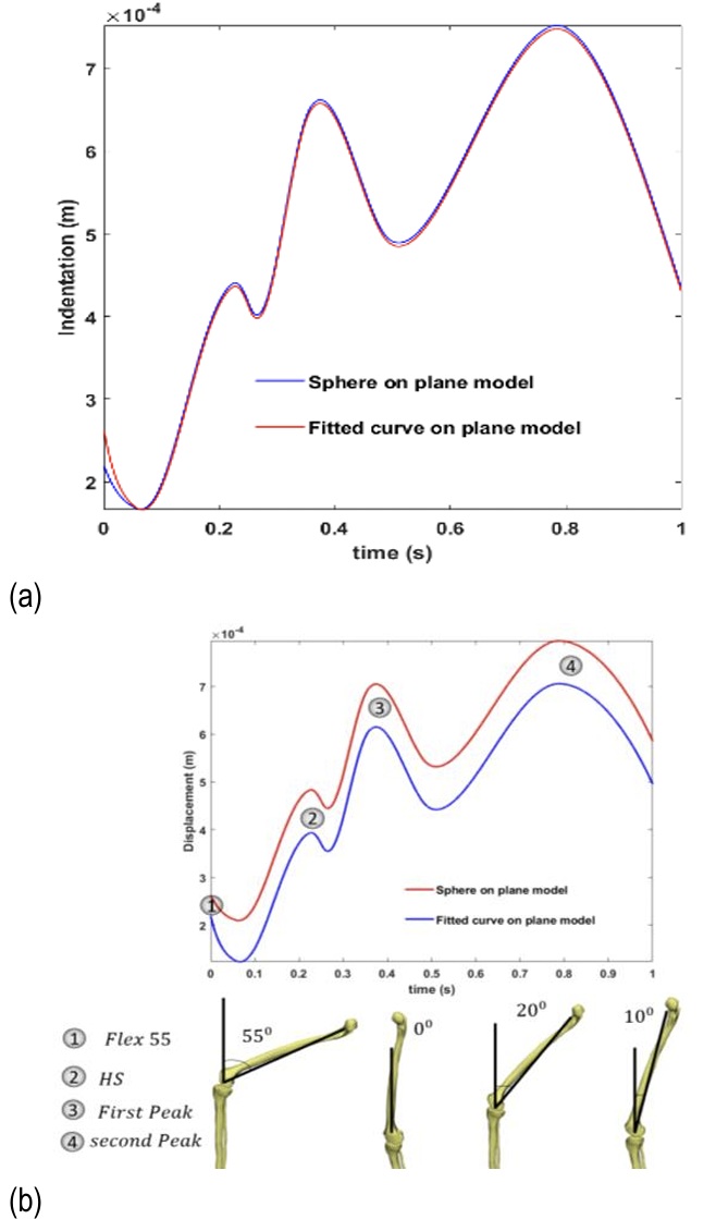 Fig. 9. Comparison of the curve-fitting method with the spherical femur model: (a) penetration depth in the medial knee joint, and (b) displacement in the y-direction