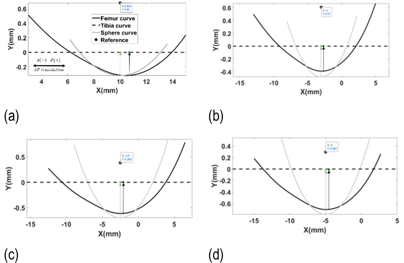 This section establishes initial conditions based on the static force solution applied to the femur. As shown in Fig. 7, the femoral reference point—corresponding to the primary Cartesian coordinates on the superior tibial surface—is positioned at an initial offset of 0.997 mm. The femoral profile was derived from potential cartilage contact regions identified through surface overlap analysis within the medial compartment. Due to the complex geometry of the femoral condyle, both penetration depth and contact trajectory were determined using a triangular mesh-based surface reconstruction algorithm applied to the three-dimensional knee model.