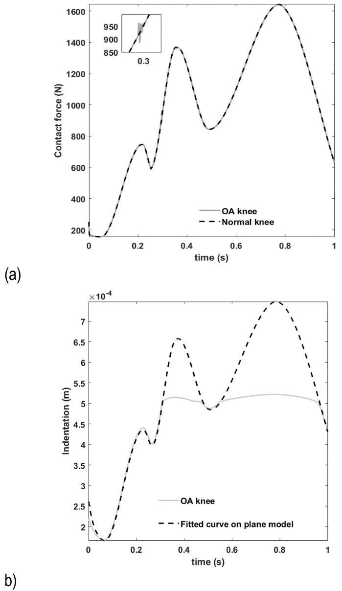 In-vivo imaging studies using combined dual-fluoroscopy and MRI have shown that peak tibiofemoral cartilage deformation during normal gait typically ranges between 7–23% of the resting cartilage thickness [65]. For a representative 3 mm cartilage layer, this corresponds to a maximum penetration of approximately 0.7 mm. MRI-based strain mapping studies have additionally reported regional compressive strains of 5-7% (≈0.15-0.21 mm for 3 mm thickness) [66], while higher deformations up to ~30% (≈0.9 mm) have been observed under more demanding loading conditions [67]. Therefore, the maximum penetration of ~0.7 mm reported in the present study is consistent with upper physiological values measured in healthy knees during gait.