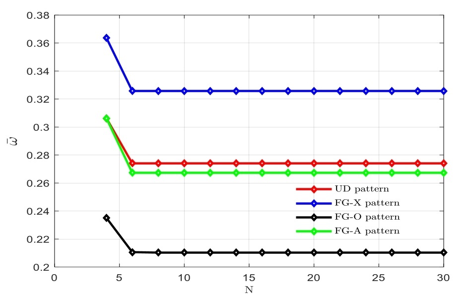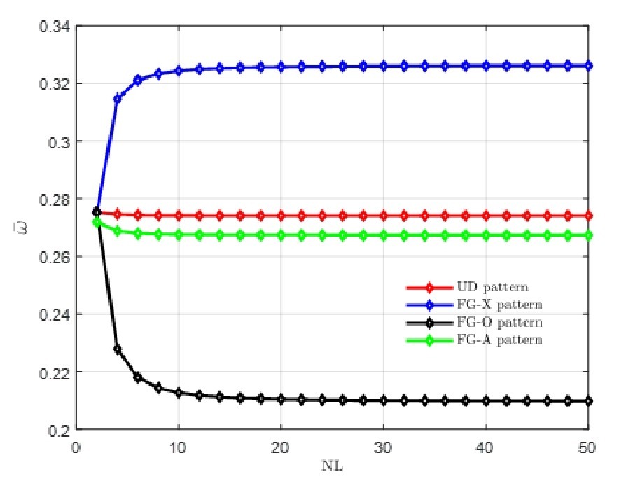 Figure 4 displays the non-dimensional frequency for S-S (simply supported-simply supported) GPLRC beam with varying numbers of layers, WGPL = 0.5% and L/h=5. It is observed that for UD and FG-A distributions, the frequency remains nearly unchanged as the number of layers increases, whereas it increases for FG-X and decreases for FG-O. Moreover, the results stabilize when the number of layers reaches NL=15. Consequently, NL=20 will be used to acquire all research findings, ensuring maximum accuracy. Among the four distribution patterns, the beam with UD pattern is the least affected by variations in NL.