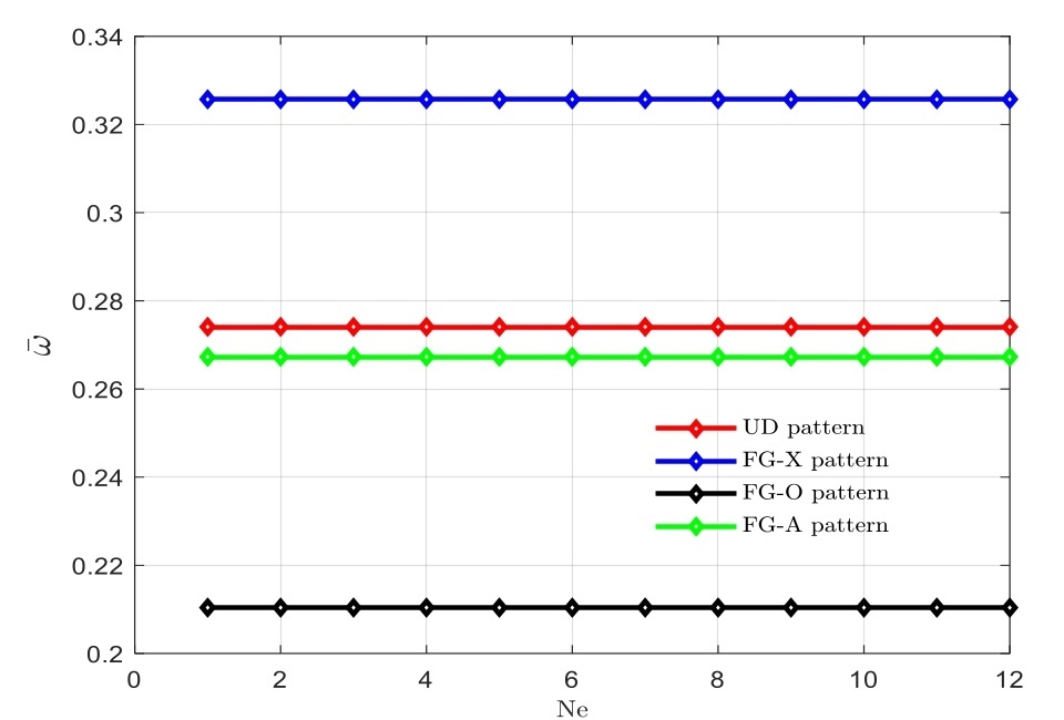 As observed in Figures 2 and 3, the outcomes begin to converge at N=4 with Ne=1, and achieve full convergence at N=6 with Ne=1. These results confirm the efficiency of the proposed method in delivering highly accurate solutions with minimal computational increments. In addition, the convergence behavior is not affected by the type of graphene platelet distribution, which mainly influences the values of the non-dimensional natural frequency. Specifically, the FG-X distribution yields the highest natural frequency, followed by the UD and FG-A distributions, while the FG-O distribution exhibits the lowest values. Based on these observations and to ensure consistency with previous studies in the literature, we adopt N=10 sample points and Ne=1 element for the remainder of the research.