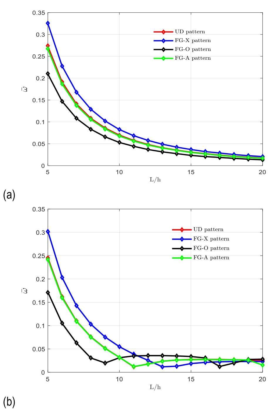 The impact of the L/h portion on the no dimensionless natural frequency related to GPLRC beams (a) ∆T = 0K and (b) ∆T = 100K
