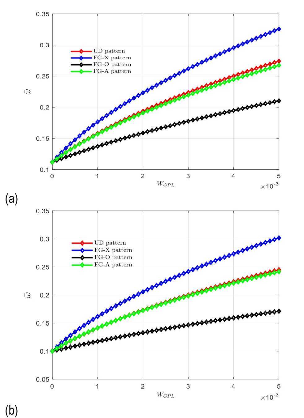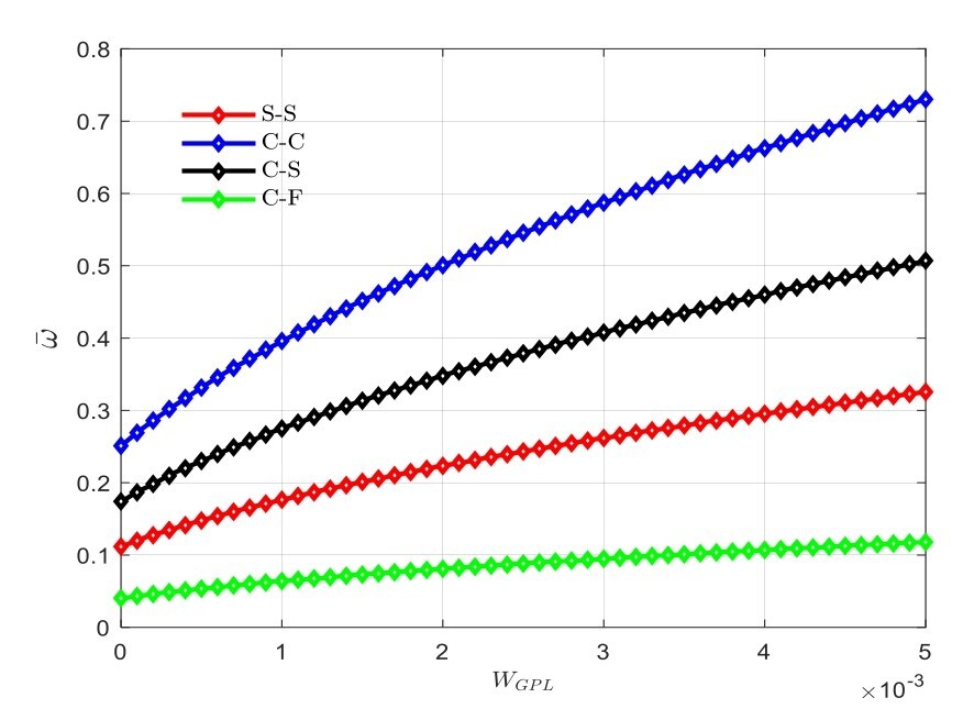 Figure 6 illustrates the impact of the weight fraction and dispersion forms of GPL on the non-dimensional frequency of FG graphene composite beams. It is observed that the frequency increases even with a little dose of GPL, and that this enhancement increases with more GPL weight fractions. In addition, compared with the “UD, FG-O and FG-A GPLRC beams, the FG-X GPLRC beam” can vibrate in higher values of frequency.