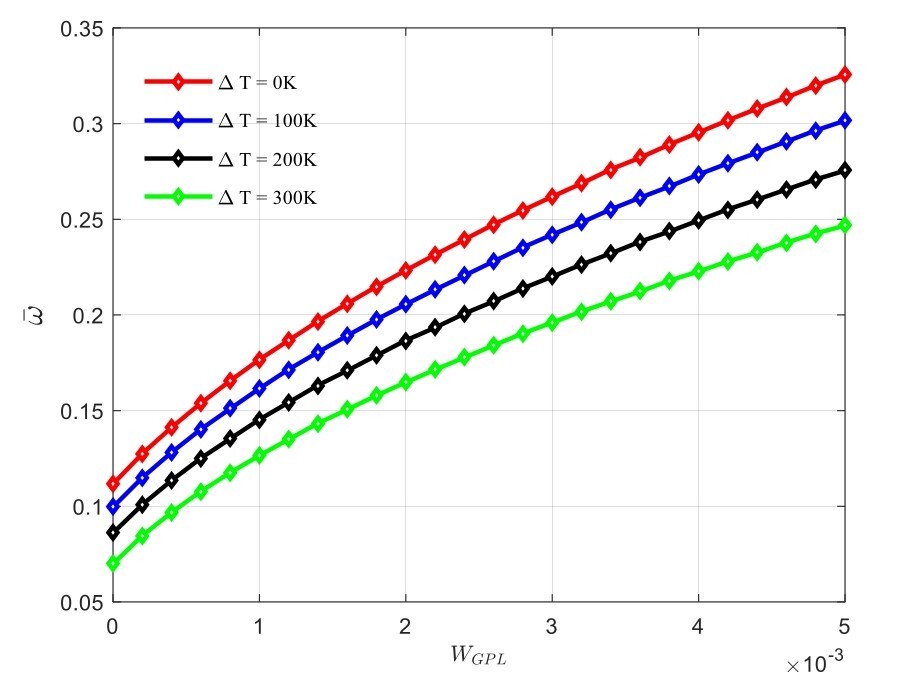 For a multi-layer “FG-X GPLRC” beam, considering L/h=5, WGPL = 0.5 and simply supported boundary conditions on both sides, Figure 8 shows the effect of the weight fraction and temperature change on the non-dimensionless frequency. Due to the high thermal conductivity of graphene, the results indicate a decrease in frequency as the temperature difference increases. This effect becomes more pronounced at higher GPL weight fractions.