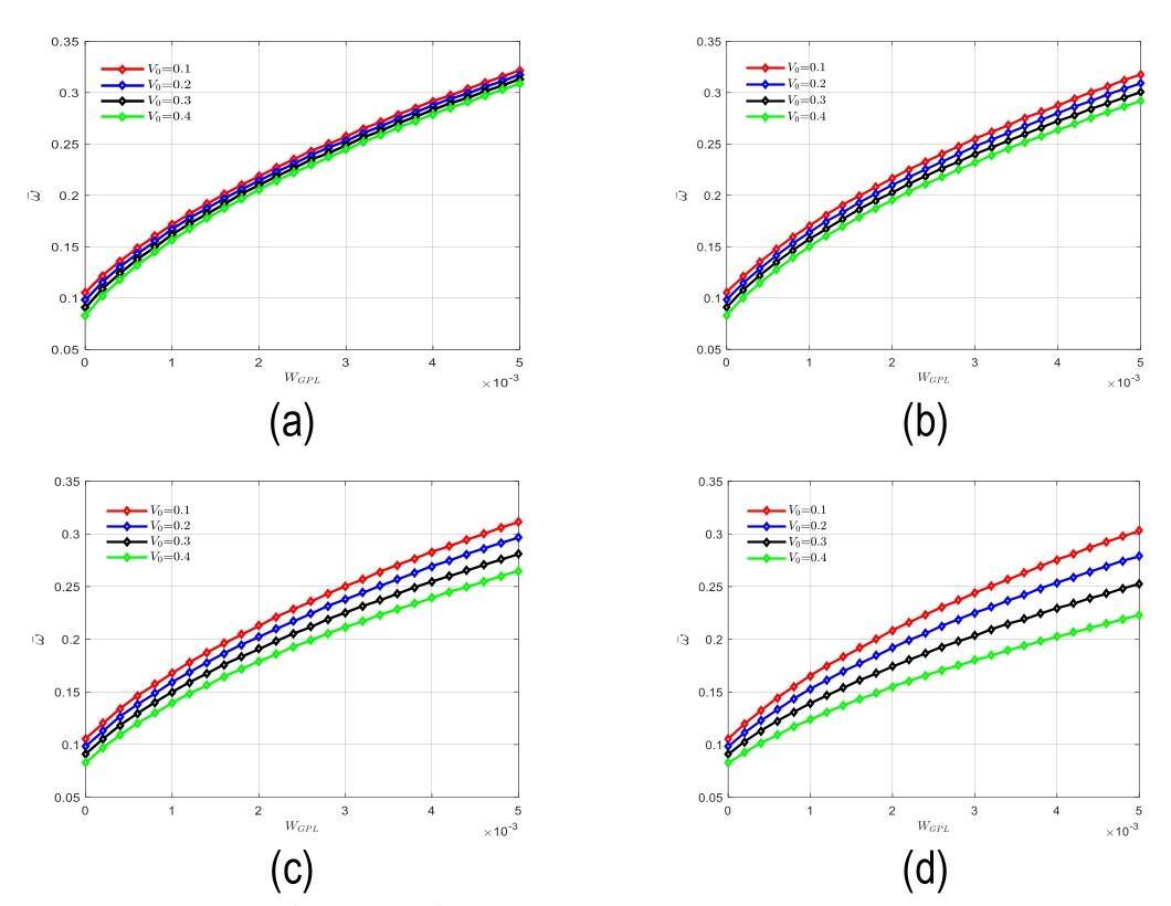 The variations in the non-dimensional vibratory frequency of FG-X pattern taking into consideration diverse values of the voltage V0 applied from an external source against the weight fraction WGPL, and considering numerous values of piezoelectric factor e0 in the corresponding figures a (e0 = 100), b (e0 = 300), c (e0 = 600) and d (e0 = 1000) are illustrated in Figure 9. As noted, that the beam stiffness decreases as the external electric voltage V0 increases leading to a decrement in the natural frequency. It is apparent, from all the figures that the impact of V0 on natural frequency becomes more significant as the weight fraction and the piezoelectric multiple increases, due to the high electrical conductivity of the graphene platelets.