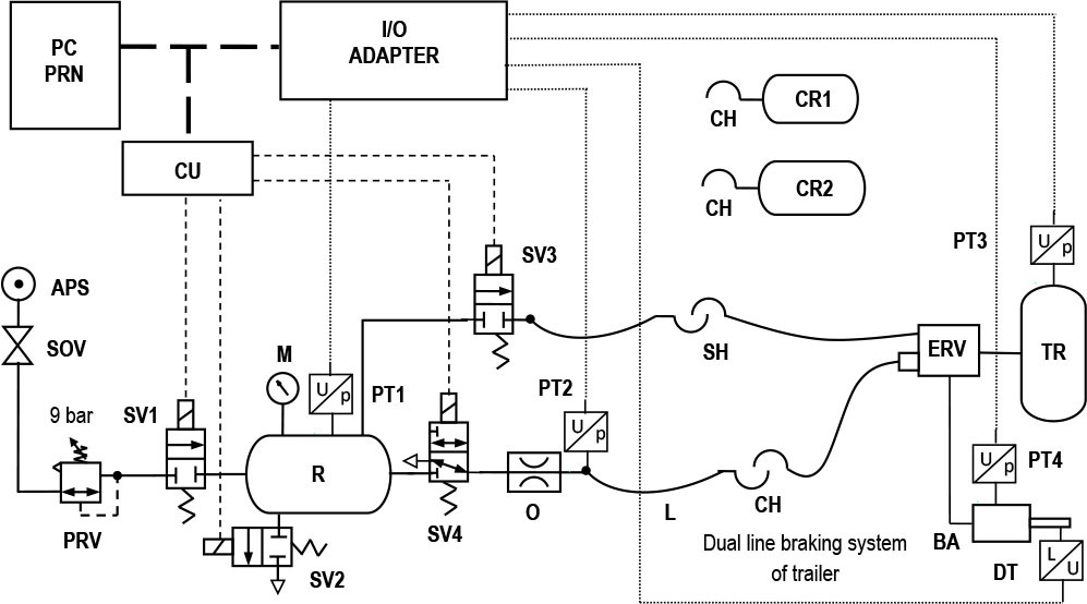 Diagram of the device for diagnosing two-line air brake systems of agricultural trailers and towed machines: APS - air preparation station; BA - brake actuator; CH – control coupling head; CR1 and CR2 - calibration reservoirs with volumes of 385± 5 cm3 and 1155 ±15 cm3, respectively (including its coupling head); CU – control unit; DT - displacement transducer (cable encoder); ERV – emergency relay valve; I/O Adapter - input-output adapter; L - line from orifice O up to and including its coupling head CH (having an inner volume of 385 ±5 cm3 under a pressure of 6.5 bar); M - manometer; O - calibrated orifice; PC – computer; PRN – printer; PRV - pressure reducing valve; PTi - ith pressure transducer; R - compressed air tank with a capacity of 30 litres; SH - supply coupling head; SOV - shut-off valve; SV1, SV2, and SV3 – 2/2 electrovalves (NC); SV4 – direct-acting 3/2 electrovalve (NC); and TR - trailer reservoir