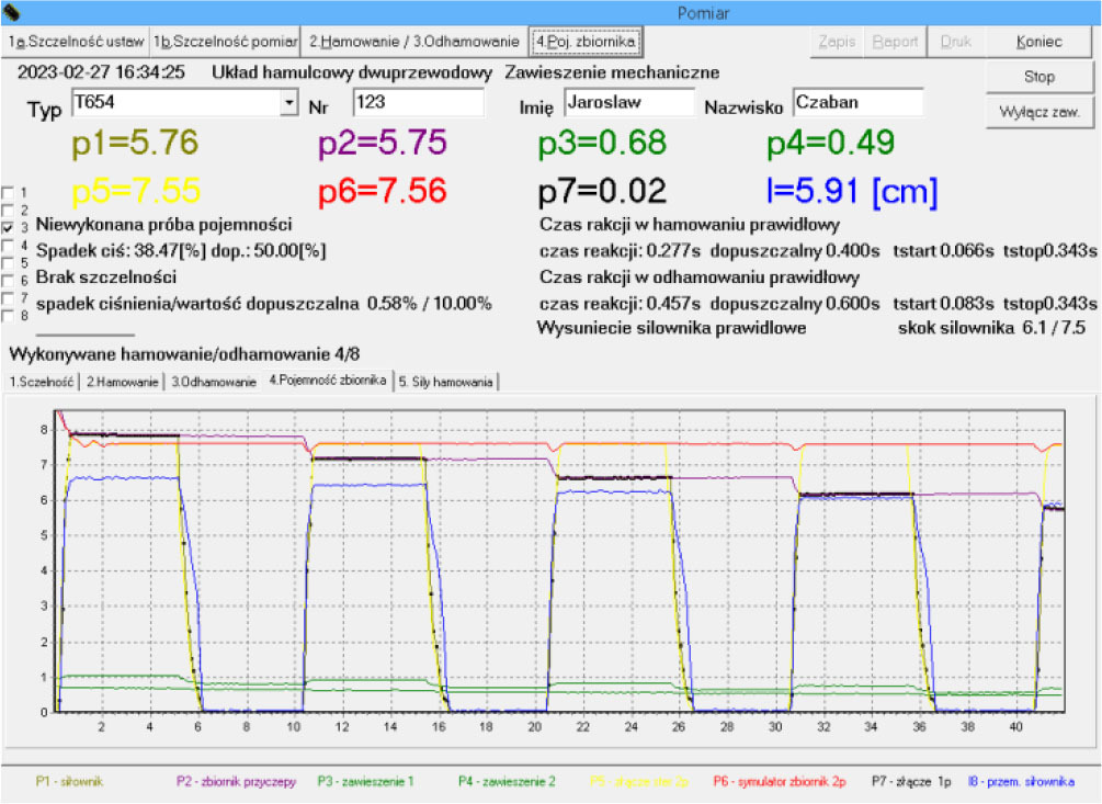 − apparatus for measuring and recording the time waveforms of pressure in selected elements of the simulator and the trailer braking system, as well as measuring the displacement of the brake actuator piston (computer, control device with measurement card, PT pressure transducers, DL displacement transducer),
