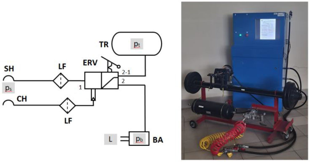 The tests were carried out under laboratory conditions at the Vehicle Pneumatic Systems Research Laboratory of the Faculty of Mechanical Engineering of Bialystok University of Technology. A model of a dual-line braking system, built from components from a T-654 single-axle trailer from Pronar [12], was used for the tests. The pneumatic circuit and a view of the trailer’s braking system connected to the diagnostic device are shown in Fig. 4. The tests included tightness checking, measuring response time and checking the capacity of the trailer’s air reservoir after adjusting the stroke of the brake actuator. A device on the laboratory equipment was used for the tests. In addition, comparative response time tests were carried out using a device operating on the production line of one of the domestic manufacturers of agricultural trailers. Their purpose was to evaluate the repeatability and comparability of response time measurements made on different devices but for the same braking system.