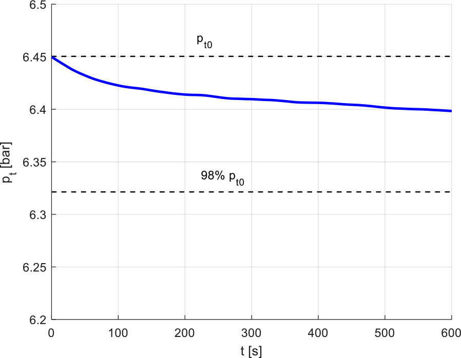 Due to the relatively long measurement times, faster and less restrictive tests are usually used in industrial settings. For example, according to Wabco, a braking system is considered to have no leaks if the pressure does not drop by more than 0.2 bar within 5 min [31]. 6.5 bar can be taken as the initial pressure.