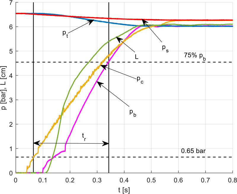The course of measured quantities during the response time test: pc - pressure of the simulator control; ps - pressure in the simulator reservoir; pt - pressure in the trailer reservoir; pa - pressure in the brake chamber; L – stroke of the actuator