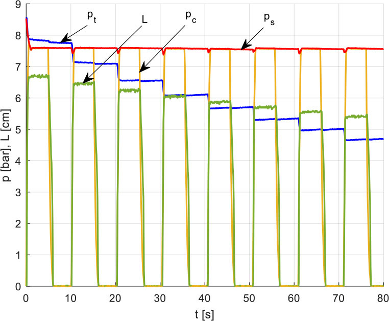 The course of measured quantities during checking of the capacity of the air reservoir: pc - control pressure of the simulator; ps - pressures in the simulator reservoir; pt - pressures in the trailer reservoir; and L - stroke of the actuator